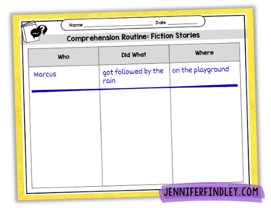 They can write a sentence or use a simple three-column chart. Either way, they’re pausing to identify the core narrative elements before moving on.